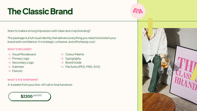 This package is a full visual identity that delivers everything you need to kickstart your brand with confidence. It's strategic, cohesive, and effortlessly cool.